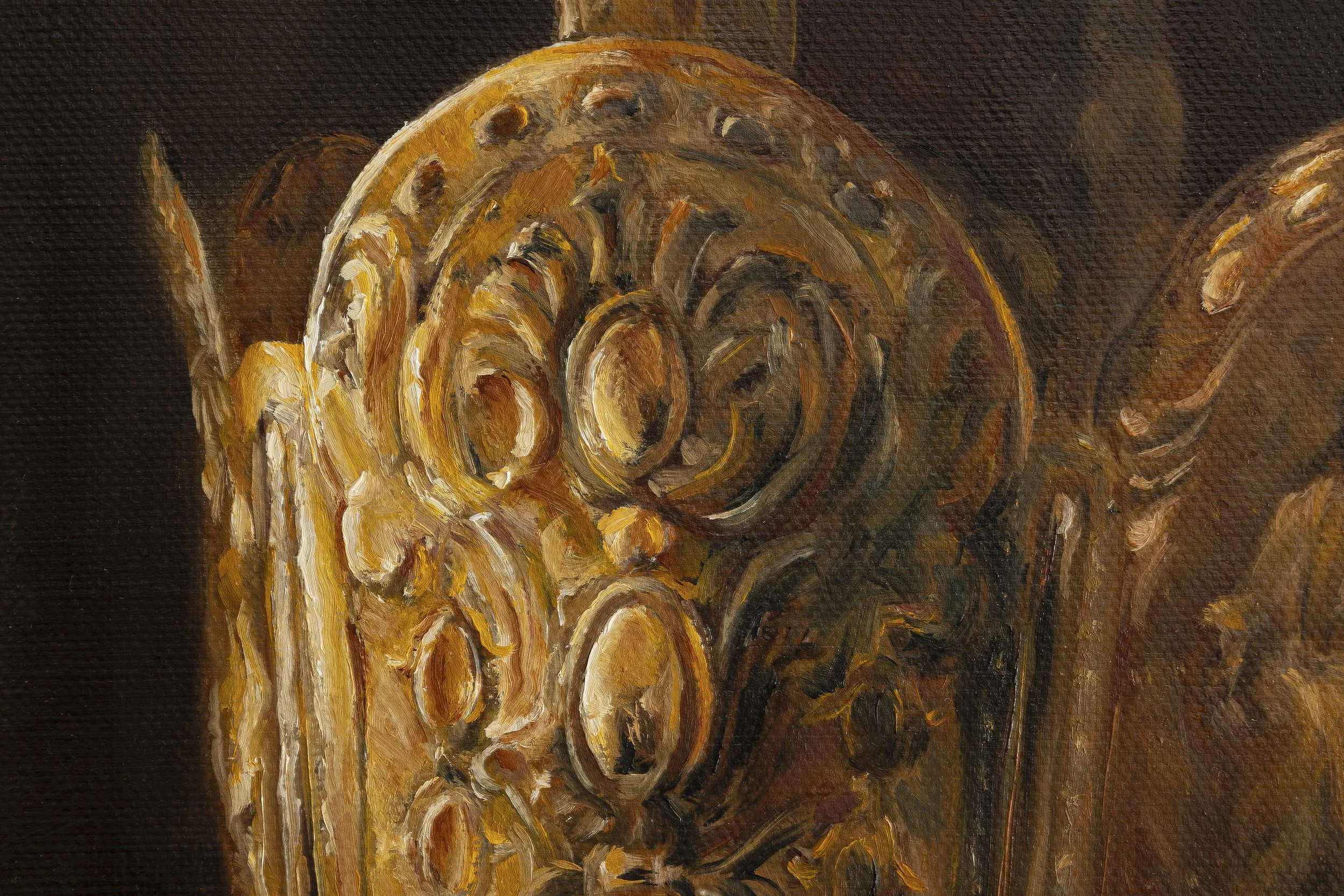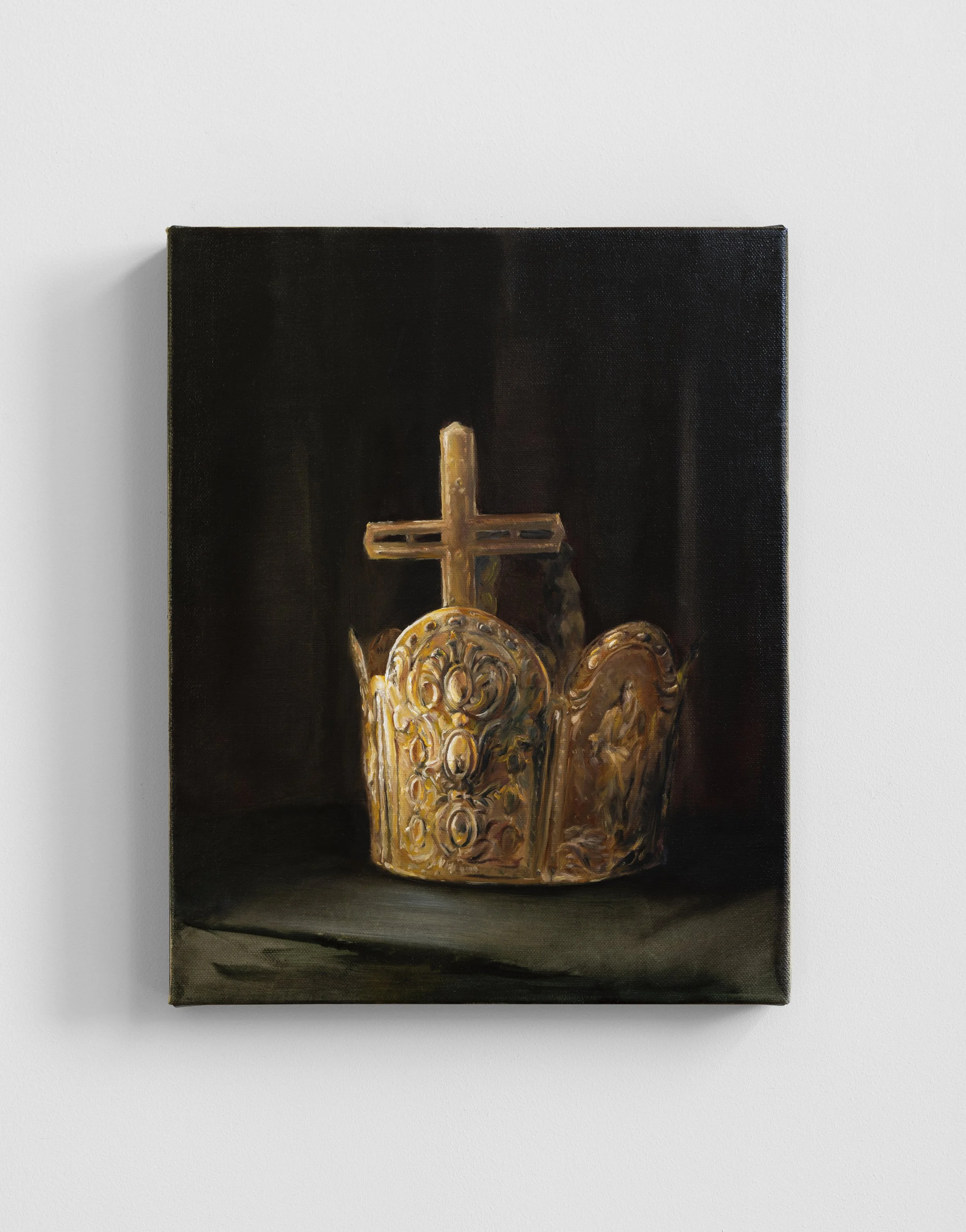 The painting stages this ambiguity. Unlike a historicist or commemorative depiction, the crown is rendered in close-up, isolated against a dark, neutral ground. The viewer is offered no context — no throne, no portrait, no scene of coronation — only the fragile shell of authority. I do not attempt to restore the object to symbolic wholeness; rather, the depiction foregrounds its incompleteness as its central content.