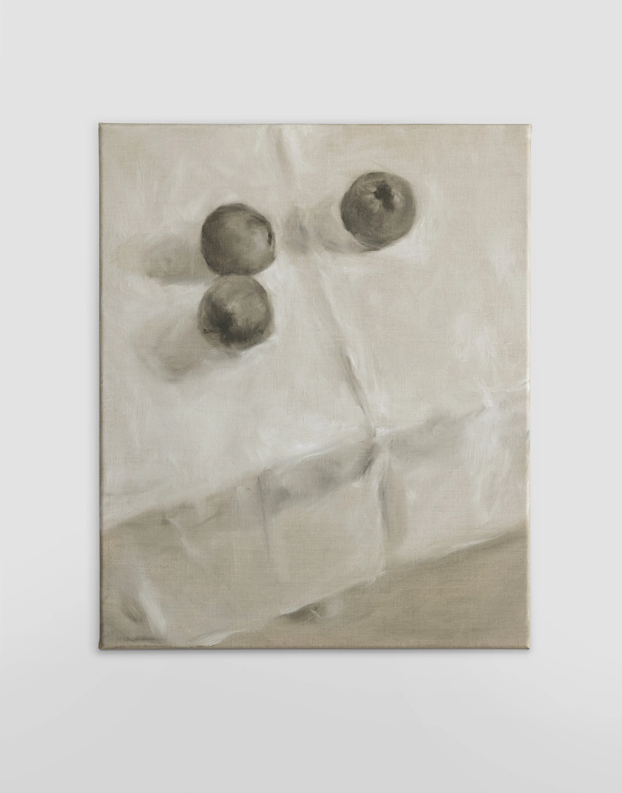 At first glance, the painting presents a restrained still life: three apples rest on a white cloth, their positioning seemingly accidental, the lighting soft and indirect. The scene is rendered in near-monochrome, in tonal values of gray and white, lending the composition a quiet, observational quality. The viewpoint is slightly elevated, as if the viewer were standing before the table. The surface is unadorned, save for a single prominent crease running diagonally across the cloth.