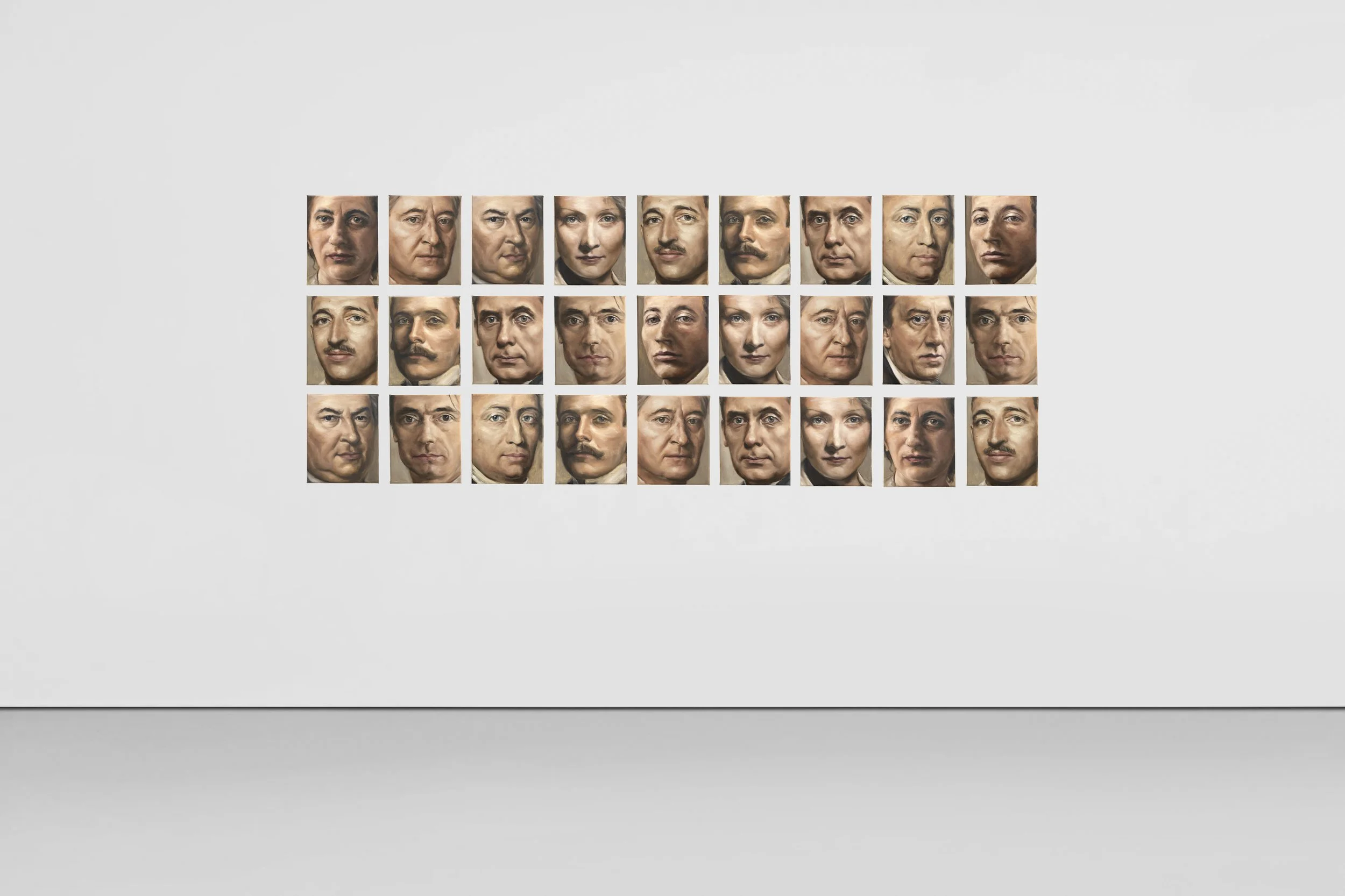 The series comprises 36 portrait studies, each painted at slightly larger-than-life scale to evoke a natural eye-level encounter from a typical viewing distance. The human figures depicted range across nearly three centuries of Weimar’s cultural and political history: artists, philosophers, composers, architects, scientists, politicians, and war criminals. They are presented in an intentional alphabetical alignment. Period detail auch as hairstyles, ornaments and clothing have been rigorously stripped away to foreground the human essence and obfuscate easy identification of era, gender, or moral stance.